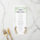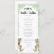 Dinosaure menu mariage à thème avec drôles de mariées dinosaures et marié et aquarelle feuillage botanique eucalyptus. Facile à customiser avec les noms des mariés et mariés, la date du mariage et tous les détails du menu mariage dans le script de typographie moderne. Fun T-Rex marié et groom dino illustrations dans les tons marron avec aquarelle verte dans les tons verts. Dino original unique oeuvre de l'artiste Catherine Sweetman