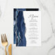 Cet élégant menu mariage moderne comprend une bordure en aquarelle bleu marine ornée d'une parties scintillant en faux argent. Le texte personnalisable combine le script d'écriture manuscrite gris charbon et les polices sans serif sur un arrière - plan blanc. La conception de l'agate bleu marine et argent est répétée à l'envers.