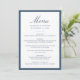 This wedding menu features “Menu” in flowing navy calligraphy, with the couple’s names, wedding date, and dining selections arranged below in classic serif type. The navy border frames the layout with a crisp, tailored feel that suits traditional, coastal, and formal weddings. The structured design and rich color palette create a refined presentation for your reception courses and place settings.
