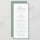 This wedding menu is styled with soft sage green calligraphy for the “Menu” heading, complemented by refined serif text for the names, date, and dining selections. The muted green border creates a calm, organic contrast against the white background, making it especially well-suited for botanical, garden, and romantic wedding themes. The airy color palette and structured layout provide a graceful way to present your reception menu while keeping the overall look light and elegant.