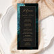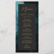 Ce menu mariage moderne et élégant dispose d'un arrière - plan d'agate bleu turquoise d'aquarelle orné d'une parties scintillant en faux or. Le texte apparaît dans une écriture élégante de couleur or et des polices sans serif sur un rectangle noir en ardoise. La conception de l'agate est répétée à l'envers.