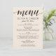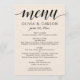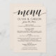 Moderne et chic neutre crémeux chaud blanc et noir cartes de menu mariage disposent d'un design typographique noir élégant avec des accents de script de calligraphie audacieux et un texte personnalisé élégant qui peut être personnalisé avec vos délicieux détails du menu du dîner et un monogramme des noms de mariée et de mariée et la date de mariage.