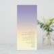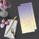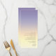 L'arrière - plan des pièces de cet ensemble mariage minimaliste est un dégradé de couleurs saisissant de l'indigo à la pêche et au jaune pâle. La carte de menu mariage présentée ici présente un design élégant et moderne et une police sans serif contemporaine pour ajouter à son attrait. Ajoutez facilement vos sélections de menu, vos initiales et la date du mariage à l'aide du modèle fourni. Recherchez ID741 pour voir l'ensemble complet des produits correspondants dans Indigo Sunset ou choisissez l'une des autres combinaisons de dégradé disponibles pour convenir à votre palette de couleurs mariages.