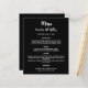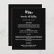 Un arrière - plan noir classique. Texte blanc. Personnalisez et ajoutez votre nom, votre date et le menu. Vous pouvez ajouter du texte, des photos à l'arrière. 1 feuille = 1 menu imprimé bord à bord.