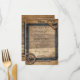 Carte de menu en bois de mariage campagnard rustique en forme de coeur, cadre en bois de brindille, roue de wagon avec chaussure en argent.