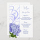 Cette carte de menu plat mariage est présentée dans le papier blanc mat de base avec une impression d'art d'une belle hydrangée unique design. La couleur du texte est un bleu Nous offrons une serviette et une plaque de papier pour correspondre. Customisez cet élément et modifiez les éléments de menu et les noms d'exemple sur le vôtre. Image stock