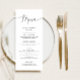 Elégante et minimaliste carte de menu dîner mariage avec texte de script moderne.