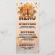 Western Thanksgiving menu avec bottes de cowboy, foin, citrouille et fleurs.