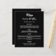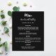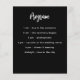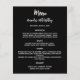 Ein klassischer schwarzer Hintergrund. Weißer Text. Front: Personalisieren Sie Ihren Namen, das Datum und das Menü. Zurück: Programm. Wenn Sie ein großes Programm haben, können Sie den Zeilenabstand verringern. 1 Blatt = 1 Menü, mit dem die Kante an Kante aufgedruckt ist.