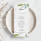 Cette carte à la carte raffinée de calligraphie tropicale verdoyante est parfaite pour un mariage moderne. Le design est composé de feuilles tropicaux à dominante verte avec une touche de fleurs blanches roses. Ce menu peut être utilisé pour une réception de mariage, un dîner de répétition, une douche nuptiale ou tout événement.