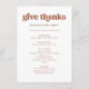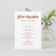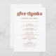 Ces menus de dîner élégants, boho Thanksgiving ou Friendsgiving sont composés d'un texte rétro en terre cuite qui dit "merci", sur un arrière - plan simple de couleur blanche.