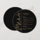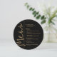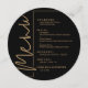 Une carte de menu de dîner ronde noire et or présente vos choix de menu dans une écriture chic, parfaite pour une réception de mariage moderne, un dîner de répétition de mariage, une fête d'anniversaire ou tout événement spécial avec un dîner assis. Personnalisez facilement avec votre menu et vos détails. PLUS de couleurs dans notre magasin.