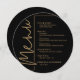 Une carte de menu de dîner ronde noire et or présente vos choix de menu dans une écriture chic, parfaite pour une réception de mariage moderne, un dîner de répétition de mariage, une fête d'anniversaire ou tout événement spécial avec un dîner assis. Personnalisez facilement avec votre menu de dîner et vos détails. PLUS de couleurs dans notre boutique.