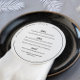 Menu mariage arrondi en blanc avec polices noires modernes et tendance, et vos noms et date mariage dans un texte incurvé le long du menu mariage ronde.