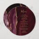 The left-hand edge of this elegant round modern wedding menu features a burgundy red watercolor agate border trimmed with faux gold glitter. The customizable text combines gold-colored handwriting script and copperplate fonts on a burgundy agate background. The reverse side features a matching burgundy and gold agate design.