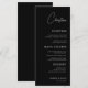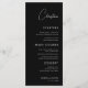 Minimalistisches schwarzes Menü mit einem benutzerdefinierten Skriptgast-Namen, das als Platzkarte- und Essführer dienen soll. Diese Karte ist ideal für Hochzeiten, Proben, Brautpartys oder Verlobungsfeiern. Sie verbindet Personalisierung mit moderner Eleganz. Das Schwarz-Weiß-Layout und die schicke Typografie schaffen ein zeitloses, stilvolles Detail, das die Tischumgebung für jede anspruchsvolle Feier verbessert.