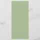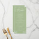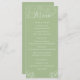 Une belle et élégante carte de menu mariage vert sauge, avec des lettres de script, des fleurs blanches en haut de la carte, et des feuilles en bas. Customisez avec vos propres options de repas.