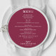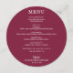 Une carte de menu ronde sur la canneberge (ou toute couleur) et du lettrage chic en blanc affiche vos choix de menu. Idéal pour un Noël de vacances ou un événement spécial avec un menu de dîner assis. Choisissez N'IMPORTE QUEL ARRIÈRE - PLAN DE COULEUR, N'IMPORTE QUEL TEXTE DE COULEUR, N'IMPORTE QUELLE POLICE ! Personnalisez facilement votre menu et vos détails pour le dîner.