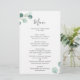 Menu de mariage élégant avec un design simple avec aquarelle peinte de la verdure d'eucalyptus dans le coin supérieur gauche et le coin inférieur droit. L'arrière est une teinte assortie de vert sage moyen. Ce menu botanique rustique mariage avec une touche moderne est parfait pour un mariage de printemps ou d'été et est imprimé sur une feuille plate pour une option économique.