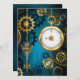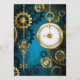 Arrière - plan turquoise, texturé, steampunk avec des engrenages en laiton et or, une clé en argent et l'horloge. Style Steampunk.