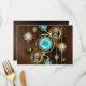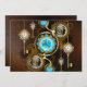 Turquoise lenses with antique watch with brass gears and golden keys on rusty, brown background. Steampunk style.