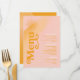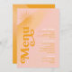Cette carte de menu mariage amusante fait partie d'une suite mariage vibrante avec une palette de couleurs aussi lumineuses qu'une journée ensoleillée, allant du rose pêche à l'orange marigold. Ajoutez vos sélections de menu, vos initiales et la date du mariage dans le modèle fourni. Le design coloré est complété par une typographie audacieuse dans un style moderne d'inspiration rétro, ce qui en fait un choix parfait pour les couples qui souhaitent ajouter une touche de soleil à leur journée spéciale. Recherchez ID1048 pour voir d'autres pièces et choix de couleurs pour cet ensemble.