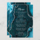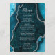 Create a striking presentation with this teal blue and silver agate marble menu, perfect for wedding receptions and versatile enough for stylish multi-purpose use. Deep ocean tones, organic stone-inspired textures, and shimmering silver accents come together to create a refined yet dramatic look that pairs beautifully with fall or winter celebrations. Designed to complement elegant, modern, and glamorous events, this agate-inspired menu can be customized for wedding dinners, cocktail hours, dessert tables, or upscale event and restaurant menus, offering timeless sophistication that extends well beyond the wedding day.