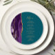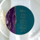 Le bord gauche de cet élégant menu mariage moderne rond présente une bordure d'aquarelle violette ornée d'une parties scintillant en faux or. Le texte personnalisable combine un script d'écriture manuscrite de couleur or et des polices de cuivre sur un arrière - plan bleu turquoise. L'envers est assorti d'une agate violette et dorée.