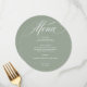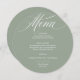 Cette élégante carte ronde mariage verte présente un style classique et ancien avec une calligraphie blanche romantique. Ajoutez votre choix de dîners pour les entrées ou les entrées, le premier plat, le plat principal ou l'entrée, et les desserts. Donnez le ton à votre réception de mariage ou à votre dîner de répétition d'inspiration italienne sophistiquée de luxe, ou à vos offres de douche nuptiale, avec ce design élégant et minimaliste.