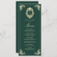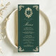 Elégante carte de menu de mariage en vert émeraude avec ornement or baroque fleurit et un monogramme victorien régal en haut. Ce design luxueux offre de l'espace pour présenter vos cours de dîner mariages dans un agencement formel et sophistiqué. Idéalement coordonnée avec la suite de faire-part de mariage baroques vert émeraude et or, idéale pour les couples qui souhaitent organiser une fête classique, élégante et intemporelle.