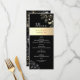 Menu de mariage noir et or vintage, botanique, bohème, chic, calligraphie, moderne, élégant avec dentelle florale dorée.