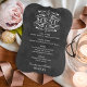 Les cartes de menu élégantes et formelles du dîner mariage sont dotées de tourbillons décoratifs et de fleurs qui encadrent le design d'inspiration vintage. Tableau noir rustique, texturé arrière - plan look avec design blanc. Personnalisez avec les noms des mariés et des mariés, la date de l'événement et les détails du menu.