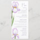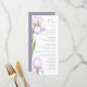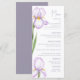 Menus pour un mariage moderne. Des iris délicats de teintes lilas doux sont représentés sur un fond pastel, créant une atmosphère de sophistication et de tranquillité. Le design est moderne et aéré, parfait pour un mariage élégant et romantique.