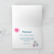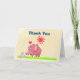 Une carte de voeux fantaisiste avec un éléphant rose debout sur une herbe verte vif renversant quelques fleurs marguerrières avec un soleil rose chaud au-dessus et un petit coeur rouge mignon symbolisant son bonheur et sa joie. Le texte dit merci en gros caractères gras. A l'intérieur, il y a un message de remerciement qui peut être personnalisé. D'autres fleurs et une illustration du soleil rose sont également à l'intérieur de la carte.