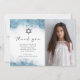 Cet élégant bar photo moderne ou carte de remerciements bat mitzvah présente un design de bordure bleu clair en imitation de marbre veiné avec un faux papier argenté, s'estompant graduellement dans l'arrière - plan blanc. Une petite étoile de David apparaît au-dessus des mots "merci" dans le script d'écriture manuscrite gris charbon, avec un message modifiable ci-dessous dans les capitales serif. Remplacez facilement l'exemple d'image par votre photo préférée. L'envers affiche un design marbré bleu et argent assorti.