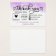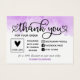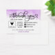 Merci pour votre paquet achat insérer dans un design mignon avec un joli script décoré de coeurs contre un lavage d'aquarelle en violet. Personnalisez avec votre logo d'entreprise et vos comptes de médias sociaux. Vous pouvez également noter un code de réduction pour le prochain achat de vos clients.