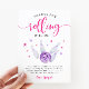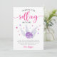Carte de remerciement pour l'anniversaire d'une fille avec un thème de bowling mignon avec une illustration aquarelle d'une boule de bowling frappant des quilles avec des étoiles roses et violettes autour. Le texte dit "merci d'avoir joué au bowling avec moi".