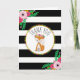 Carte de remerciements baby shower illustrant l'illustration d'un bébé renard portant une couronne de fleurs sur un arrière - plan rayé noir et blanc avec motifs floraux en haut à gauche et en bas à droite. Des invitations assorties à des douches pour bébés sont disponibles à Jill's Paperie.