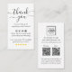 Moderne et élégant noir et blanc merci pour votre commande insérer des cartes avec un nom de média social personnalisable, hashtag, une demande d'avis, 2 codes QR pour un site et une boutique, votre logo d'entreprise, et l'espace pour ajouter des détails de code ou des informations que vous voulez que vos clients connaissent. Cette version n'inclut pas de code coupon personnalisé, mais elle est disponible dans la boutique. Les icônes peuvent être modifiées ou supprimées en cliquant sur le bouton de personnalisation.