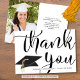 Carte de remerciements photo de graduation moderne avec typographie de script de calligraphie moderne pour le MERCI de titre, accentué avec une casquette noire de graduation et personnalisée avec le nom de votre diplômé et l'année de classe sur le front. Le côté arrière présente l'image de votre diplômé et un message préimprimé ou choisissez de supprimer l'exemple de texte pour laisser la zone vide pour écrire des notes d'appréciation. OPTIONS : L'échantillon est de la taille 5x7"; d'autres tailles sont disponibles sur la page de commande. ASSISTANCE : Pour obtenir de l'aide sur la modification ou la personnalisation du design, le changement de couleur ou si vous souhaitez coordonner des éléments, contactez le concepteur AVANT LA COMMANDE via l'onglet MESSAGE Conversation Zazzle ci-dessous ou envoyez un courriel à makeitaboutyoustore@gmail.com.