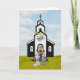 Une mariée, un marié, et leur ecclésiastique devant l'église accomplissant la cérémonie de mariage sous le ciel rempli de nuages bleus et les colombes de l'amour en vol. Mignon, amusant et totalement personnalisable.