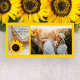 Envoyez un message personnel de remerciements et de gratitude avec le charmant Carte photo de tournesol rustique et de Mariage campagnard de dentelle. Convient pour les cadeaux reçus après une ferme rurale, une grange, un ranch ou une douche nuptiale occidentale, une fête de fiançailles ou le thème du mariage. Cette photo de remerciement décontractée et élégante est une photo florale d'une fleur de tournesol jaune, d'un voile de mariée blanche et d'un mouchoir en lin vintage en dentelle avec un arrière - plan de grange patiné marron rustique.
