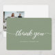 Présentez notre Carte de remerciements Mariage minimaliste simple et vert - une façon gracieuse et sincère d'express gratitude à vos invités mariages. Ce Carte de remerciements est doté d'une police de calligraphie élégante de type script, qui incarne un design moderne, chic et simple qui résonne avec l'essence de votre journée spéciale. 📜 🖋️ Élégant Script Elegance : La police de calligraphie de type script élégante apporte un air de sophistication à vos cartes de Merci, reflétant la grâce et le style de votre mariage. 👫 Appréciation personnalisée : Personnalisez la carte avec vos noms, votre date de mariage et un message de coeur customisé, créant un signe d'appréciation personnalisé pour vos invités. 💚 Vert Accent Charme : La couleur vert accent insuffle une touche de charme naturel, améliorant l'attrait visuel et s'attachant au jeu de couleurs du mariage. 📸 Méménite chère : Y compris une photo spéciale de votre grand jour transforme la carte en un souvenir chéri qui permet à vos invités de revivre la joie de la fête. 💐 Thoughtfulness : Utiliser une photo avec des invités d'honneur tels que parents, grands-parents, demoiselles d'honneur, groomsmen, filles de fleurs, porteurs de bague, et Godparents ajoute une couche supplémentaire d'attention, les faisant se sentir valorisés et chéris. 🙏 Gratitude sincère : Faites part de votre gratitude sincère à vos invités mariages, leur faisant savoir à quel point leur présence a contribué à enrichir votre célébration. Que votre mariage ait été une affaire intime ou une grande fête, notre Carte de remerciements de Mariage minimaliste Vert Simple offre une façon significative et personnalisée d'express votre appréciation. Customisez, chérissez, et envoyez votre gratitude avec une carte qui résume magnifiquement le sentiment de votre journée spéciale.