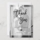 Cette carte de remerciements mariage moderne et élégante dispose de votre propre photo couvrant entièrement l'arrière - plan. Une superposition en blanc clair présente une typographie de script noir tendance.