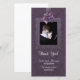 Le damas violet foncé donne un ton riche à ce Carte de remerciements mariage à thème gothique. Une bordure assortie avec de beaux détails encadre votre photo. Joli rose avec un parfum de parties scintillant sombre apporte une touche spéciale. Téléchargez votre photo pour remplacer cet espace réservé aux photos. Le texte est prêt pour vous à customiser avec vos informations.