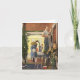 Illustration vintage de Noël représentant une jeune fille courant dans la maison avec une étoile pour le haut de l'arbre de Noël tandis que son père et sa mère décorent la maison en préparation des fêtes.
