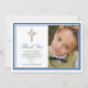 Elégante première sainte communion, cartes de remerciement avec un simple arrière - plan blanc qui peut être changé à n'importe quelle couleur, une double bordure bleu marine, une croix religieuse en argent avec des fleurs blanches, une photo de votre enfant, et un modèle moderne de remerciement facile à personnaliser.