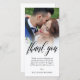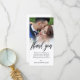 Carte photo personnalisé avec votre propre photo mariage. Merci écrit dans un magnifique script noir au-dessus d'un message personnel à vos invités mariages. Le bord entre photo mariage et texte est adouci par un dégradé blanc. Ajoutez aussi vos noms !