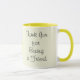 La conception jaune pâle de tasse comportant les mots "Merci pour Beeing un ami" d'un côté, et un mignon gaffent l'abeille de l'autre. Des mots peuvent être customisés à celui que vous souhaitiez.