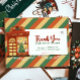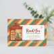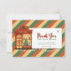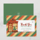 Retro Vintage "Merci pour votre commande" Carte de remerciements de noël modèle pour un insert de commande pour une petite entreprise e-commerce. Ajoutez votre logo, vos coordonnées et les détails optionnels de remise. Ce design comprend une petite boutique, des lampes à cordes de Noël et un arrière - plan rayé vert, rouge et jaune.